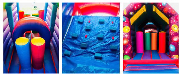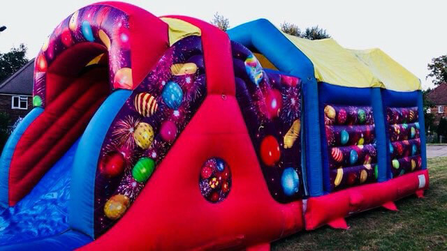 Included:Â Assault course suitable for adults and children, matching crash mats, 50m power cable and a blower