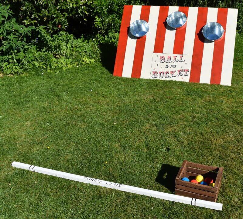 Included: Ball in the bucket board with 3 buckets, a throw line and a bucket of balls to throw