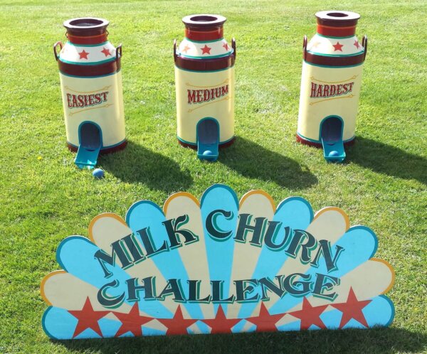 Included: 3 colourful hand painted large milk churns, hand-painted sign and a tin of balls