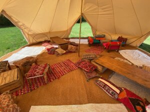 Our chill-out tents are beautifully furnished with soft seating, rugs, ambient lighting, and decorative touches to create a warm, inviting space where guests can relax and unwind.