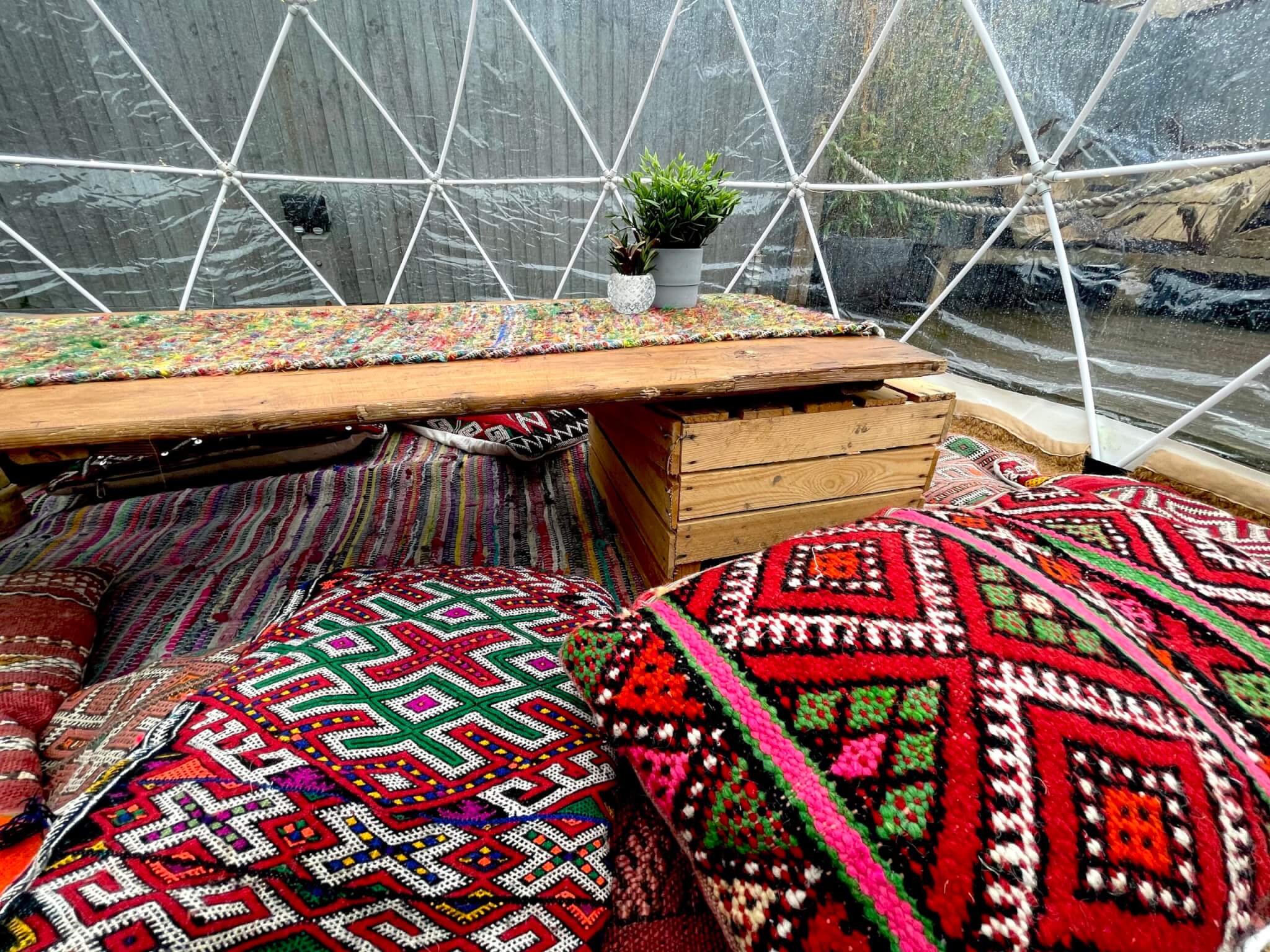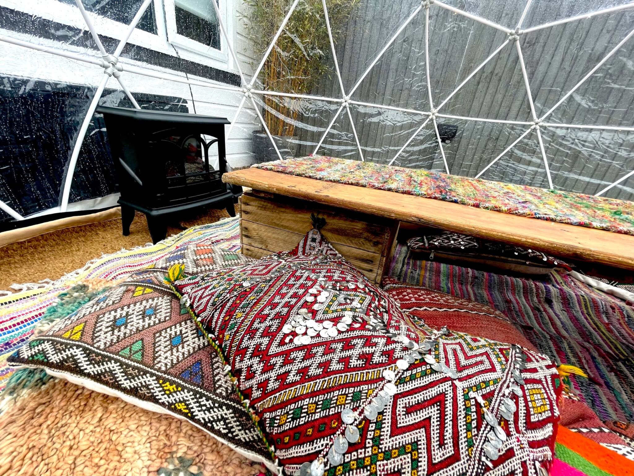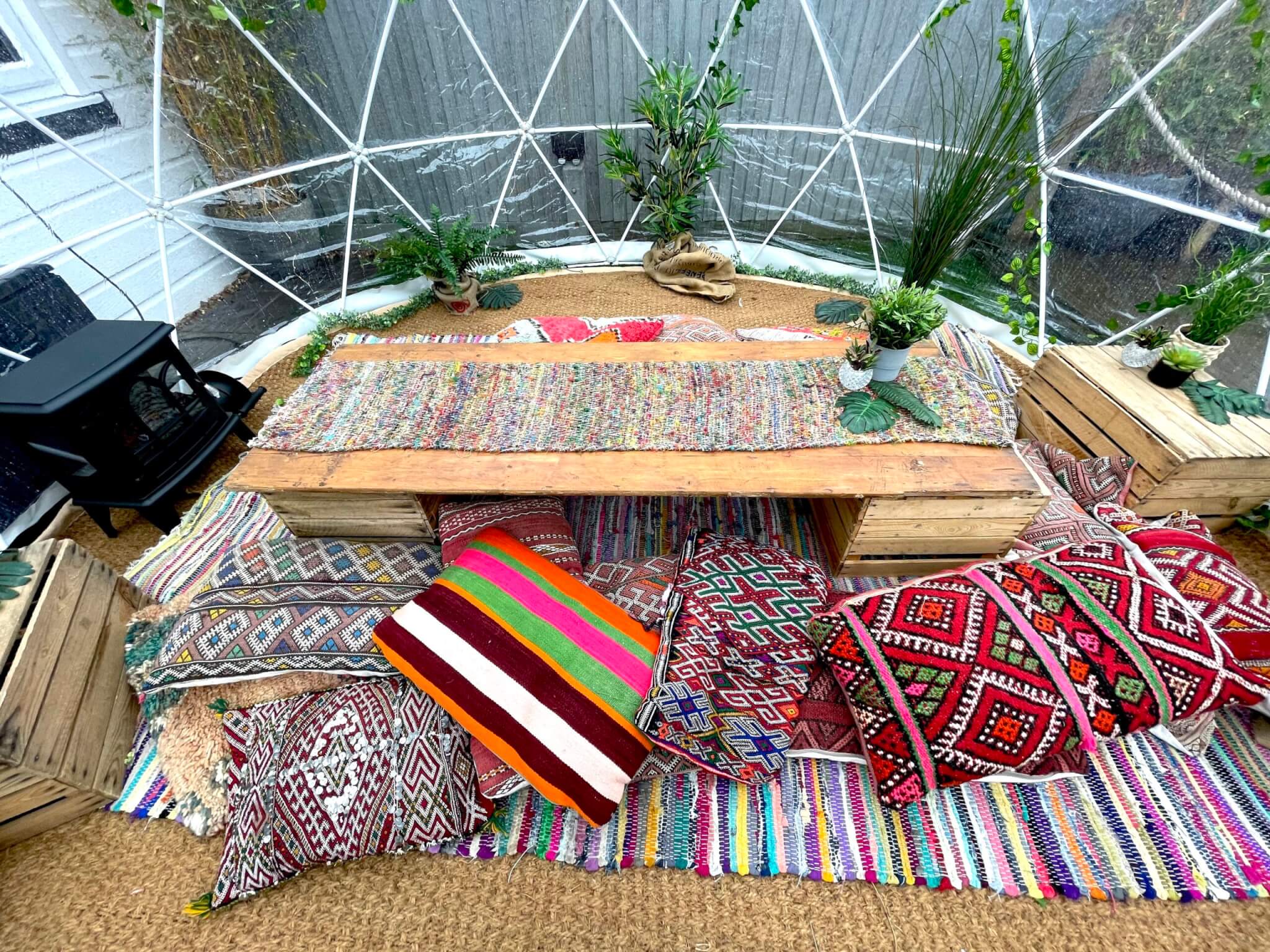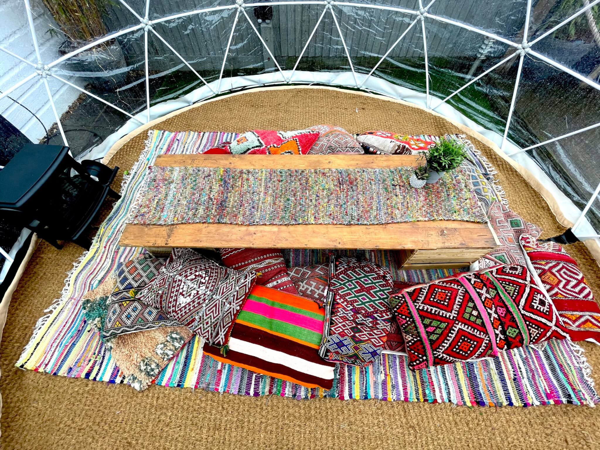 Comes complete with a low table, colourful cushions, heater and fairy lights.
